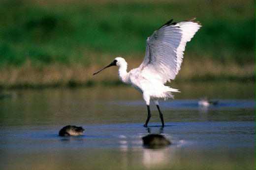 棉絮般的紅雲中忽然鑽出一個巨大的身影(這是對當時的我而言,畢竟當時我不過是只早熟的雛鳥嘛!),比肩飛在我身畔,細長的頸子,寬闊的翅膀,姿態顯得空靈飄逸。雪白的毛色被夕照抹上淡淡胭脂,唯有臉部、長而末端扁圓的鳥嘴、那雙纖纖玉腿是發亮的玄鐡黑。黑色臉孔裡閃爍的漆黑雙瞳,突顯了一股神秘慧黠。