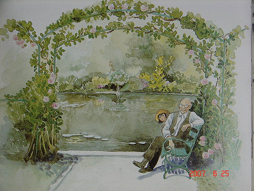 之後她們搭火車到Giverny,拜訪莫內的花園。在這本繪本裡,妳可以親眼看到莫內跟他的家人居住的地方,還有他畫睡蓮的池子跟那座日本橋。