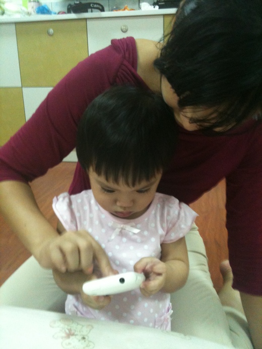 最後,學妹直接抱著他,把手機拿給他,他馬上就很認真的手機來了,看來,手機對妹妹的吸引力還是相當大的,讓他縮短了對陌生人的觀察時間。