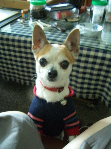 走失時穿著如圖的藍衣帶紅帽的7號衣服,紅色的頸圈,