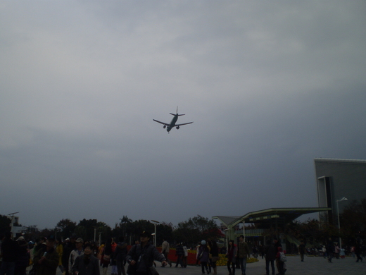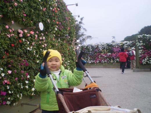 在士林夜市美食廣場這邊坐花博2號免費接駁車到達圓山公園區的入口,一進去視野很寬廣,廁所也很大,頭頂上飛過的飛機也很吸引兒子的注意。因為我們3點多才到,所以先逛外面的花牆和花海,很不幸弄丟了相機的一顆電池,現有的這一個又沒電了,所以只幫兒子照了幾張照片。