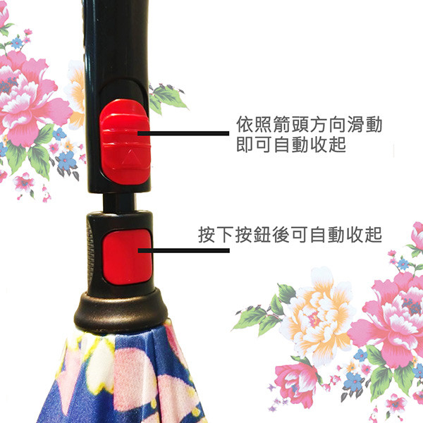收:將手把上的滑蓋照箭頭方式往後滑,即可自動收起雨傘