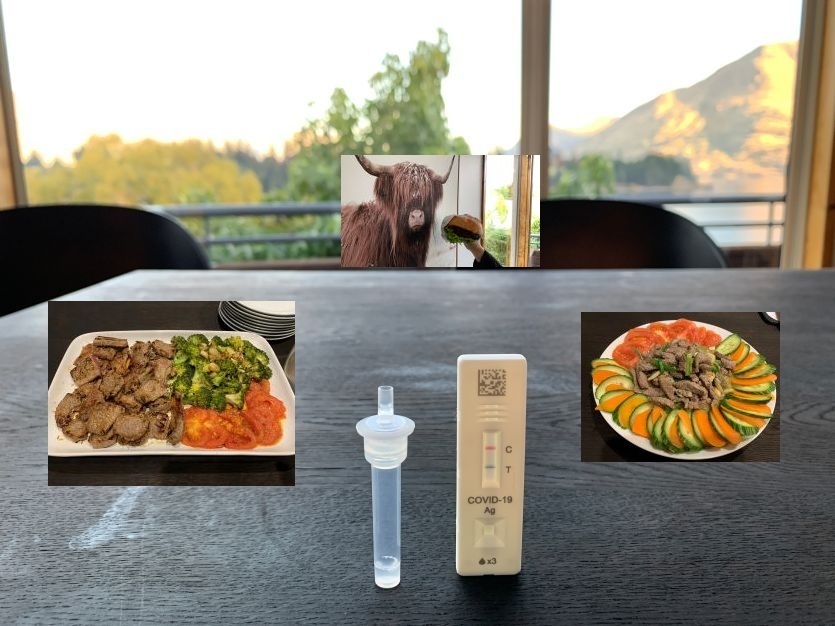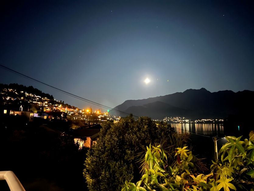 話說這次旅遊,近半數團員結束南島行程後即將返台,部分成員染疫症狀益加明顯嚴重,連高速滑車都放棄了體驗,整理行囊時翻出入境領取的快篩試劑,檢測結果果然確診,引得眾人紛紛獻出鼻孔以身試戳,不出意料試劑都是兩條線,原本守住三年未遭病毒攻破的完壁紀錄,終究在紐西蘭淪陷,始料未及。皇后鎮民宿最後的一個晚上,年輕人圍在撞球檯把握難得相聚時光,有人期待皇后鎮深夜偶有極光顯現機會,即使無緣親眼看見,繼蒂卡波湖觀賞滿月升起,又見一輪皎潔明月,月光和瓦卡蒂普湖湖畔燈火,旅程中有此美麗夜景幾何,更不用說 一早起床迎接無以倫比的湖景朝陽。