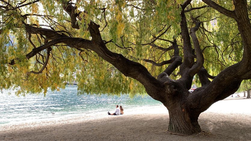滑車排隊人潮眾多,部分團員不耐久候,竟然滑不滿6次,提前下山返回民宿。但兒子身負重任,途中轉往熱門漢堡店外帶大家的午餐,店家隔壁還有烘焙屋和冰淇淋店,完全是市區中美食熱區,吸引著川流不息的顧客。我們先買了麵包咖啡享用,就近於公園中伴著美麗楓葉景色止飢,回到民宿又等了一會兒,終於等到兒子帶回漢堡。漢堡巨大且味美是特色,感覺有普通漢堡二倍的份量,費了一番功夫還是把他咀嚼下肚,非常過癮。傍晚前往鎮上購物街、海灘街閒晃,人潮漸散,連二天也走進皇后鎮公園,驚嘆園中高聳龐大的林木,黃昏微涼,散步於瓦卡蒂普湖碼頭和沙灘,聆聽現場藝人音樂演奏,氣氛浪漫。