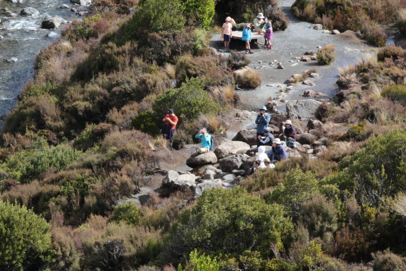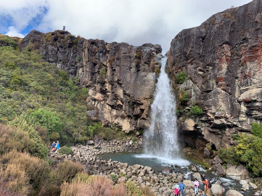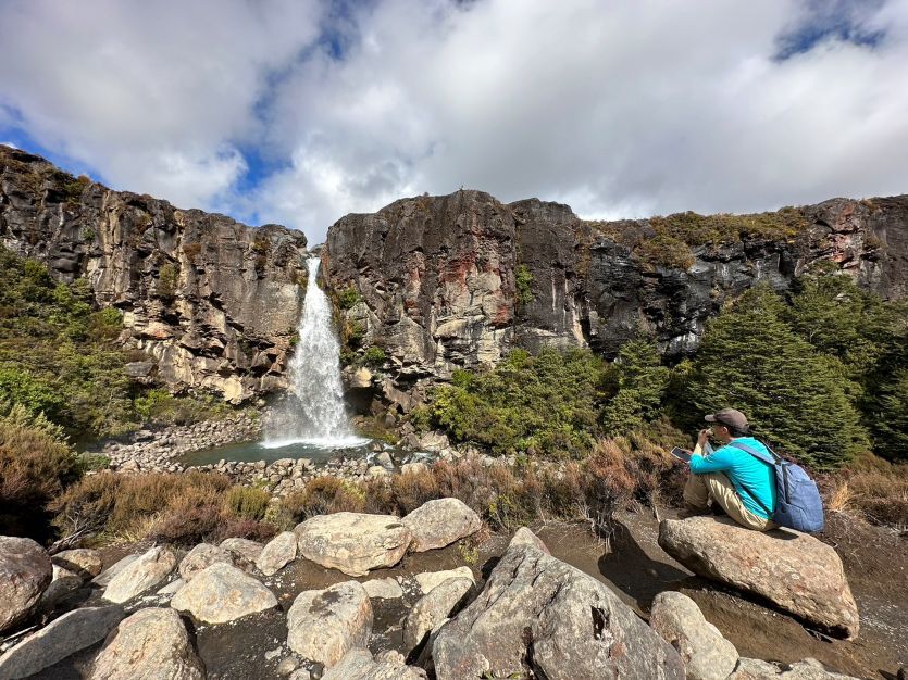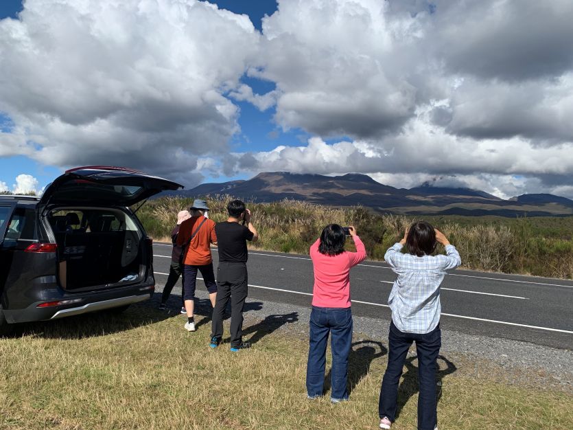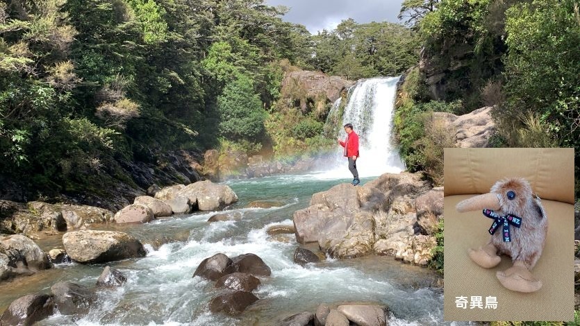 健行完畢,我們順道去了路程超短的鬥海瀑布,因魔戒取景而聞名,此處就是魔戒裡咕嚕抓魚的地點,在長距離健行後造訪此處,陽光映照正掛著一道彩虹,視覺上的療癒感恰到好處。資料上說附近有看到奇異鳥的機會,大家還沿路安靜地尋找了一會兒,可惜這群夜行性害羞客終究與我們無緣。當日厚重的雲層始終盤踞在東加里羅火山頂,被影迷戲稱為末日火山的魯阿佩胡山山頭,僅在我們於路邊苦等時曇花一現,隨即像躲債主般隱入雲中。那份神祕的孤傲,彷彿在訴說大自然不輕易示人的威嚴。儘管沒能見到完整的火山全貌,但那種在荒野中守望的悸動,已成為這趟旅程中最深刻的留白。