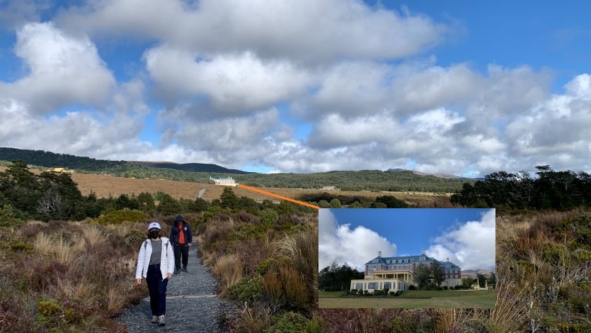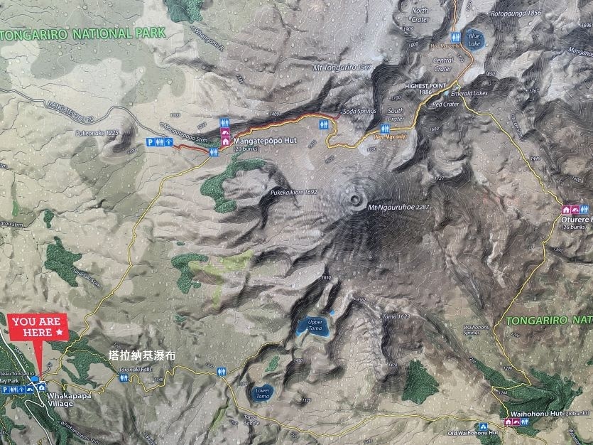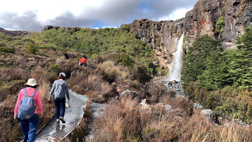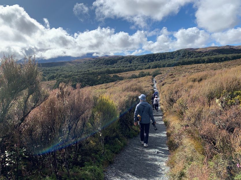 東加里羅國家公園為魔戒電影中末日火山的取景地,清晨我們從陶波湖小鎮驅車出發,直奔公園安排一日健行。首站抵達瓦卡帕帕村遊客中心,女兒先以地圖說明健行的路線和範圍,其實只是很小的區塊,完全是輕鬆散心的行程。館內詳盡展示了人類滑雪運動的演進歷程,從早期的木製雪板到現代科技裝備,我們靜靜瀏覽著人類滑雪運動的百年歷程。隨後經由城堡飯店前方,我們踏上全長約6公里的塔拉納基瀑布環形步道。步道地形多變,穿梭於灌木叢與開闊的高原火山岩地之間,沿途綻放著如星火般的紅色的帚石楠與白色龍膽,在蒼茫的高原上燃燒著細微卻堅韌的生命力。