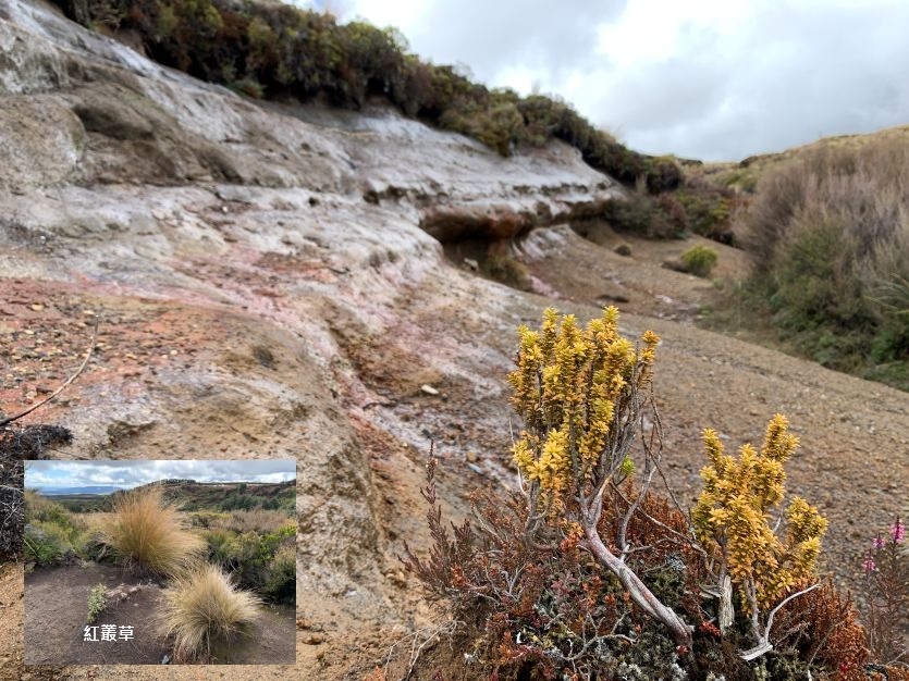 ▲山地黃楊和紅叢草,火山岩惡地中顯得特別顯眼