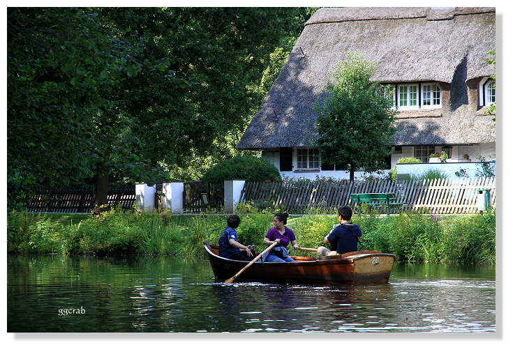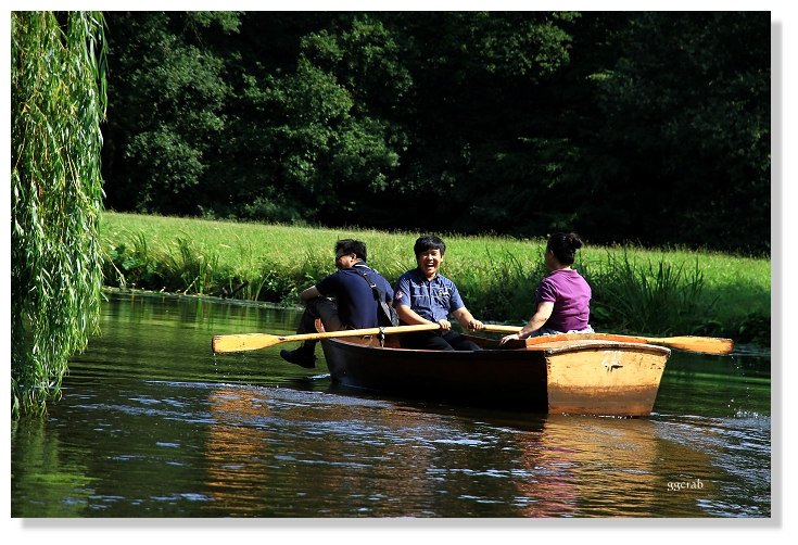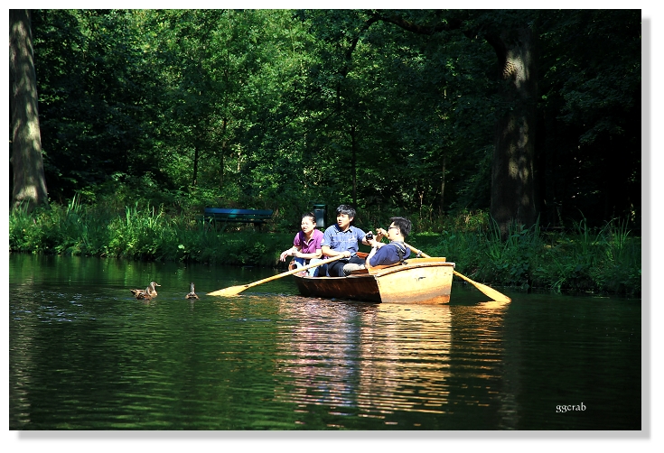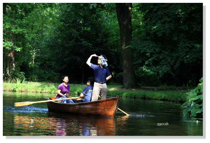 划船不在原本計畫內,登小船前也因為不諳操槳和全程距離不明而猶豫許久,但船才移出租船小屋,所有顧慮全拋到了腦後。一行人分乘二船,擔當操槳者雖笨拙卻不減興致,迂迴向前划行著,激情退散也逐漸適應漂浮於水面的感覺。水道不寬,綠草合攏,麗日午後,陽光從林蔭間花花地灑將下來,偶有清風撲面,野鴨來訪,擺盪漫渡十分愜意舒服,似進入桃花源。風險無虞之際,大膽站立於船頭,一幅帥氣的樣子,原來是山寨版少年Pi來了!