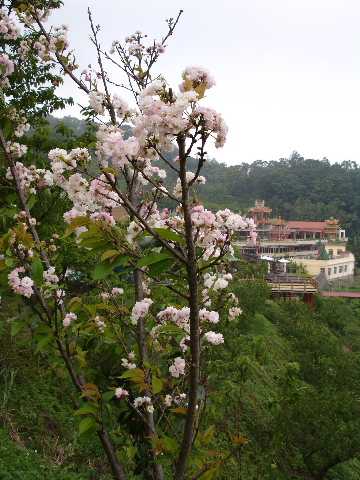 四、五月,本是賞油桐花的季節,在桐花紛飛的山上,意外遇見櫻花滿開,她是淡紅色多層花瓣的松月櫻。