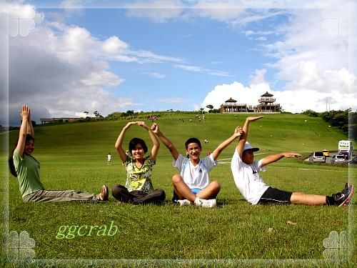 這麼棒的景點,難得全家總動員外出踏青,怎能不把握機會拍照留下踅影,甚至開始KUSO搞怪起來,因為到了高台讓人「HIGH」,既然演員有四人,就讓我們留下愛的印記,讓這世界有愛,「LOVE」在鹿野高台,成功!經過草原續行向前,人群車子聚集的涼亭處即是飛行傘運動場出發地點,初次蒞臨,乍看之下,有點嚇人。