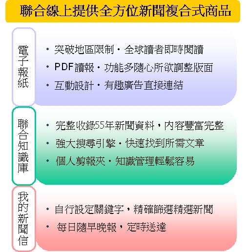 即日起聯合知識庫推出全方位新聞工具三合一方案,只要1,999元起,便能擁有讀報零重量、閱讀不沾墨的「PDF電子報紙」,可查詢55年歷史新聞的「聯合知識庫」以及讓使用者自行設定關鍵字篩選精選文章的「MY DATA我的新聞信」,閱讀、搜尋及彙整新聞的需求通通一指搞定。詳情請至聯合知識庫活動快訊 http://udndata.com 查詢。