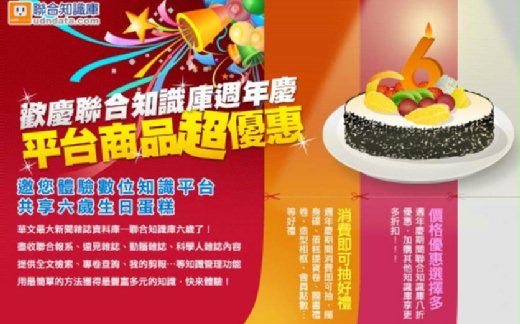 聯合知識庫歡慶六週年,為回饋長期使用者,即日起至 3月 25日止,聯合知識庫八折優惠,加購遠見雜誌知識庫、動腦知識庫及科學人雜誌知識庫更可享七折以上的折扣。週年慶期間在聯合知識庫平台消費,還可再參加週年慶抽獎活動,有機會把隨身碟、圖書禮券、蛋糕提貨券…等生日好禮帶回家!活動詳情請上聯合知識庫 http://udndata.com。