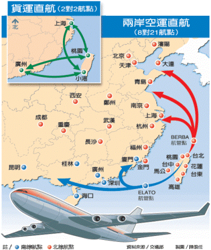 看到那張圖(請看上圖), 讓我毛骨悚然! 一下子開放這麼多直航站(桃園、高雄小港、台中清泉崗、台北松山、澎湖馬公、花蓮、金門、台東等八個航點), 台灣的國防安全還能維持下去嗎? 大陸間諜, 黑心食品, 偷渡客, 罪犯等可以從四面八方進來台灣, 到時維安所需耗費的成本不曉得有多少? 而且恐怕根本擋不了! 況且只要中國解放軍藏在民航機裡從各個機場登陸, 就可以在"一日"內解放台灣! 而航線截彎取直更是不利於台灣, 讓台灣軍隊喪失台灣海峽的制空權.