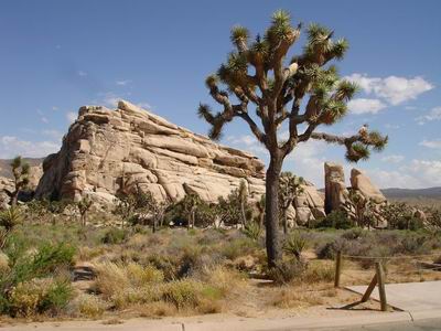不過Joshua Tree National Park 和其他的沙漠地帶又非常不同, 因為這裡有相當特別的大石頭. 走進公園2英里之後將會被一望無際的石頭所震撼! 這些石頭當初由不同的結構混合所組成的, 而後不同結構的部分對風化有不同的抵抗力, 而造就了各種奇形怪狀的樣子! 有的石頭像軍艦, 有的像人頭, 有的像牡蠣, 有的像房子, 千變萬化的形狀讓人嘆為觀止! 而最出名的則是那個像拱門(arch)的石頭, 雖然我覺得它更像有生命力的豆苗!