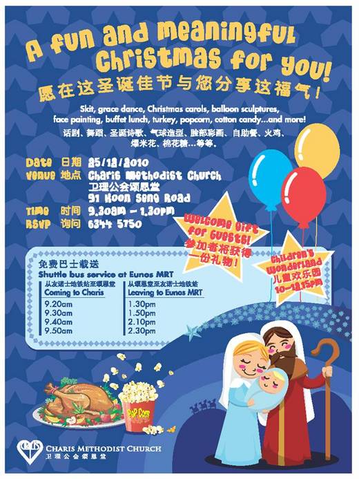 Dear friends, you and your family are cordially invited to attend the annual Christmas Carnival organized by Charis Methodist Church to mark Christmas. Bring your family and have a day of fun, joy and get-together! See you~