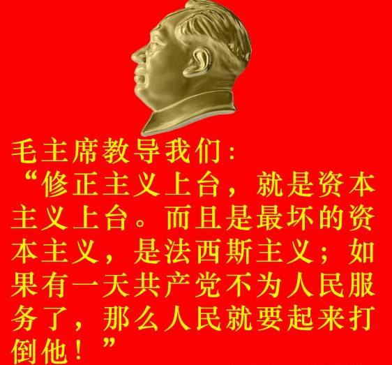 毛澤東:「修正主義,或者右傾機會主義,是一種資產階級思潮,它比教條主義有更大的危險性。修正主義者,右傾機會主義者,口頭上也掛著馬克思主義,他們也在那裡攻擊“教條主義”。但是他們所攻擊的正是馬克思主義的最根本的東西。他們反對或者歪曲唯物論和辯證法,反對或者企圖削弱社會主義改造和社會主義建設。在我國社會主義革命取得基本勝利以後,社會上還要與部分人夢想恢復資本主義制度,他們要從各個方面向工人階級進行鬥爭,包括思想方面的鬥爭。而在這個鬥爭中,修正主義者就是他們最好的助手。」--《關於正確處理人民內部矛盾的問題》(1957.2.27)