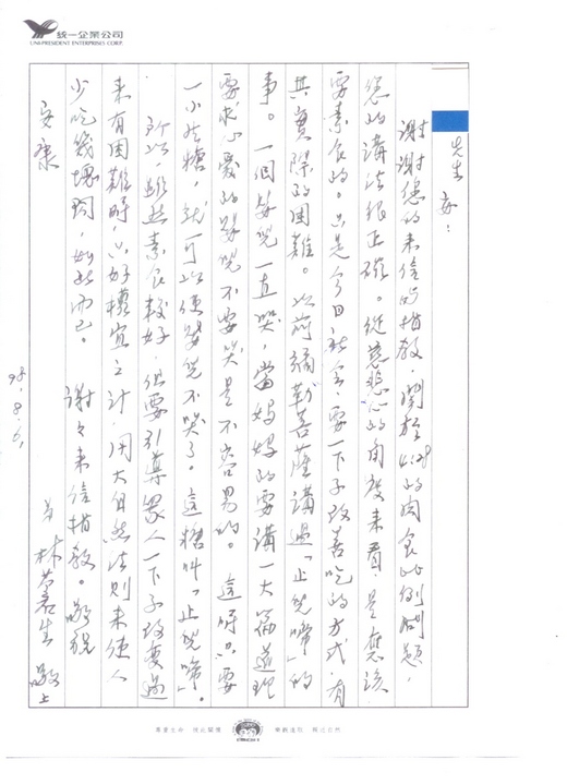 (編按:這封信為《隨便想想》作者林蒼生總裁於今年八月回覆讀者peace的親筆回函,peace先前於本部落格中留言,原信可見於「訪客簿」中。為方便網友參閱,已附於本文之後。)