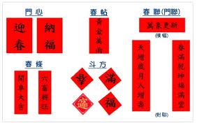一般而言,門之兩旁貼上對聯,上方應加橫聯,才算完整的一幅春聯,亦有人在門板上貼「門葉」,單扇門貼上五個字的「單葉」、雙扇門則分別貼上兩個字的「雙葉」,例如「百福」、「千祥」,也有人貼門神畫像取代雙葉。在窗戶上方則貼「春仔」(雖是正方形但以菱形方式呈現),春仔除了「春」字、「福」字外,尚有富、貴、吉、祥、財、祿、旺等等,有些人還會將春字或福字倒過來貼,象徵「春到了」或「福到了」,希望在新的一年討個吉利。米缸則貼「滿」字、穀倉貼「五穀豐登」、菜櫥或冰箱上貼「山珍海味」、車上貼「開車大吉」、畜舍貼「六畜興旺」、碾米機或機械類貼「川流不息」。