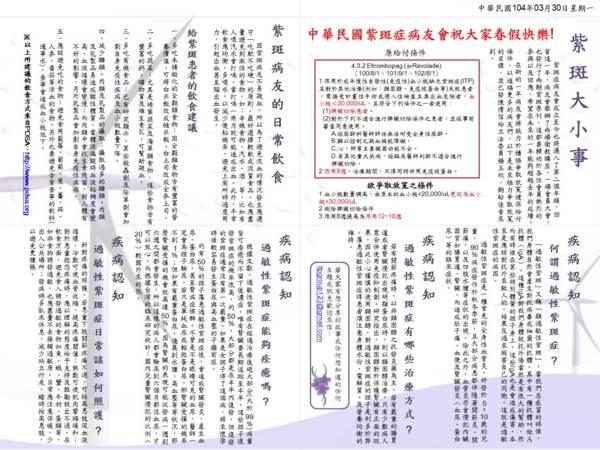 中華民國紫斑症病友會為提供病友完整資訊以及交流平台 故於2014年2月17日發行 紫斑大小事 除了提供疾病、衛教資訊外 也非常歡迎各位病友投稿 與我們分享您的故事^^ 歡迎投稿至 itpgroup12...