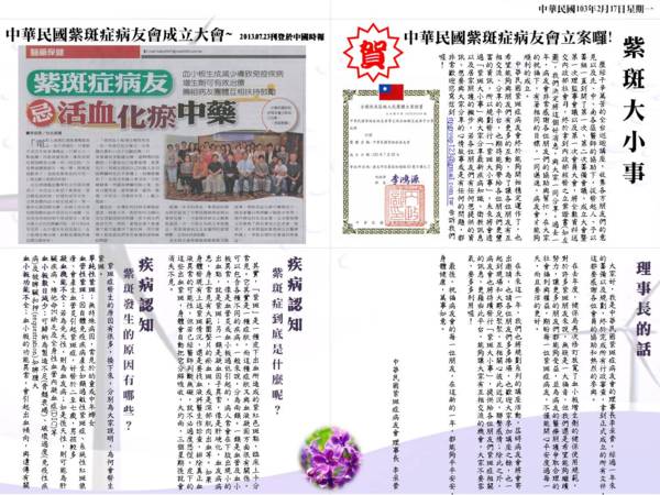 中華民國紫斑症病友會在2014年8月23日舉辦會員大會 並有好友投稿至中華民國紫斑症病友會與各位朋友們一起分享紫斑症的心路歷程 故於2014年11月11日發行紫斑大小事第二期 本期提供疾病、衛教資訊、...