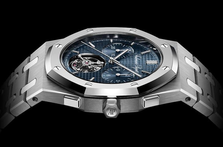 至於RD#5的錶殼延續Royal Oak "Jumbo"經典比例,錶徑39mm、厚度8.1mm,首次將自動上鍊計時碼錶與飛行陀飛輪整合其中,為兼顧雙重複雜功能,愛彼採用雙層玻璃盒藍寶石水晶鏡面設計,其內側中空為指針與自動盤的旋轉提供足夠空間,同時維持外觀比例。錶殼與鍊帶皆以鈦金屬打造,面盤採Petite Tapisserie小格紋圖案,深植人心的雲夜藍50色調配合計時小錶盤的同心圓紋處理,3點與9點方向的計時盤與面盤色彩一致,提升辨識度,而12點鐘方向飾有愛彼得特別版草寫標誌,象徵150週年紀念,指針與時標都選用螢光塗層、並以白金製作,計時指針則採鈦金屬材質,兼顧輕盈與視覺辨識。