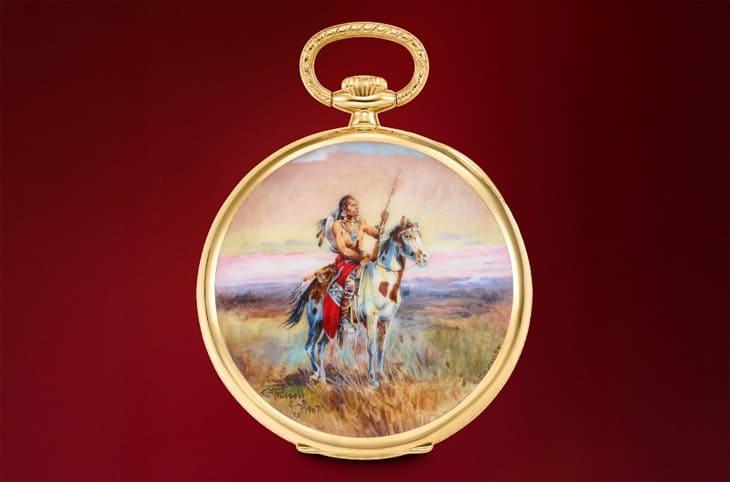 另外,百達翡麗也提供了足以撼動市場的重量級作品,有一款黃金材質、具有"Serpico y Laino"印字的手錶被認為是目前已知僅存的一只,由於歷史背景特殊,其黑色琺瑯面盤搭配夜光時標與指針,完整呈現20世紀中期的經典工藝質感,估價為25萬~45萬美金(約合台幣785萬~1410萬),反映出市場對稀有古董百達翡麗一向保持的高度信心。另一件值得留意的,是名為The Scout的百達翡麗懷錶,由原藏家後代釋出、並曾為1995年「百達翡麗傳奇名錶」展所準備,錶殼上的微繪琺瑯作品由大師G. Menni手繪,靈感源自C.M. Russell的1907年畫作,是典型「藝術性與工藝價值並重」的作品,估價介於10萬~20萬美金(約合台幣310萬~630萬)之間。