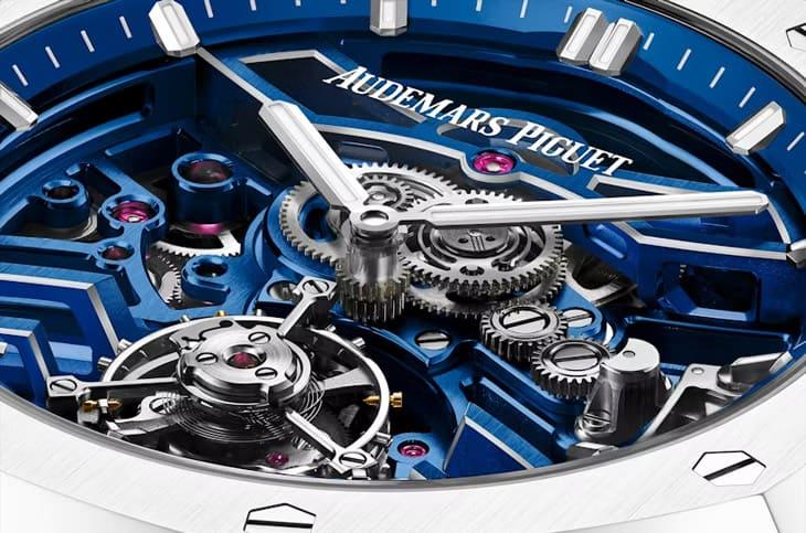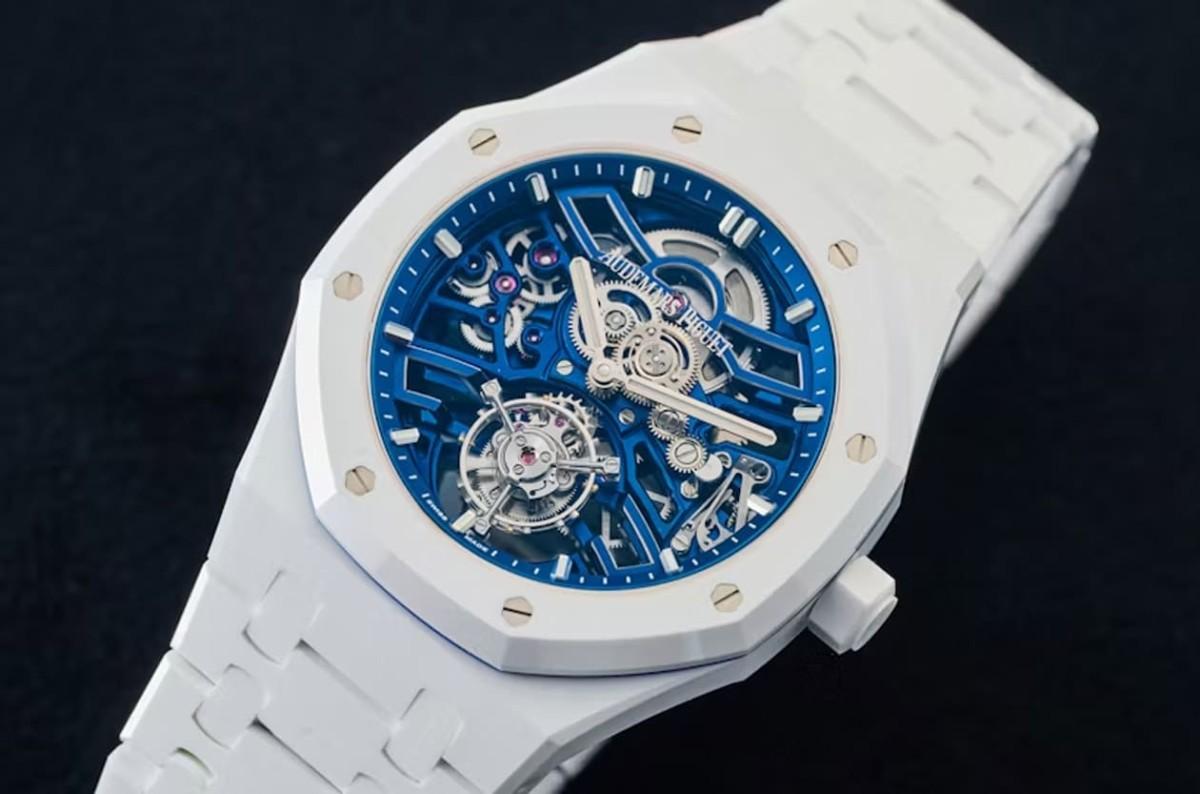 把焦點拉回手錶本身,Ref. 26735CB的完成度,完全對得起這段曲折的身世,它具備41mm白陶瓷錶殼,厚度僅10.6mm,在鏤空陀飛輪作品中算是相當收斂的比例,佩戴視覺俐落,也保有50米防水的實用規格,不過它真正吸引目光的,仍是面盤結構帶來的強烈對比感,白色陶瓷的冷冽框架之中,是經過陽極氧化處理的藍色鏤空主夾板與橋板,色調鮮明卻不浮誇,讓整體呈現出高度現代感,這種配色在皇家橡樹家族中本就少見,搭配大面積鏤空,更讓光線在不同角度下產生豐富層次。