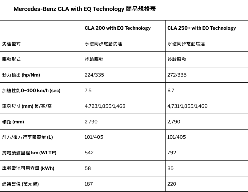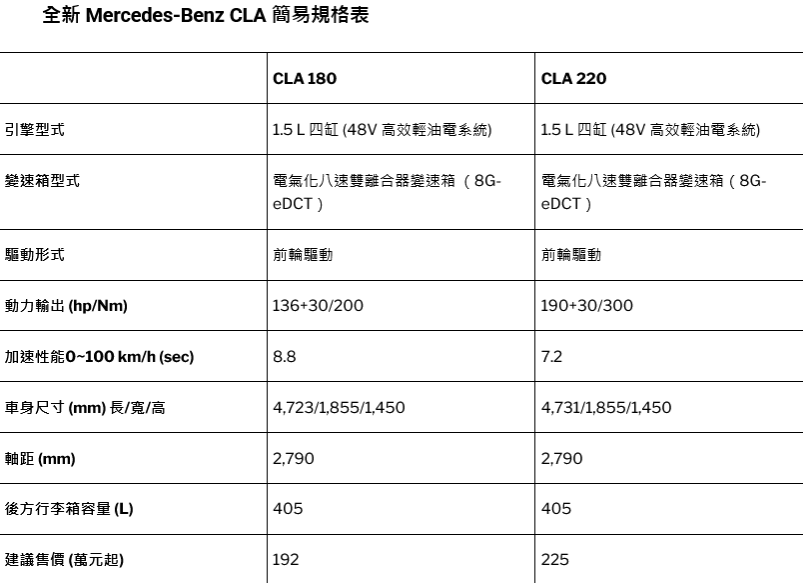 目前 Mercedes-Benz CLA 已正式在台上市,純電與燃油車型同步開賣:純電車型 CLA 200 with EQ Technology 建議售價 187 萬起,CLA 250+ with EQ Technology 為 220 萬起;燃油車型 CLA 180 為 192 萬起,CLA 220 為 225 萬起。即日起於全台 Mercedes-Benz 展示中心開放賞車,並預計本月起開始交車。這波不只是新車上市,而是 Mercedes-Benz CLA 正式宣告進入「軟體定義」的全新時代。