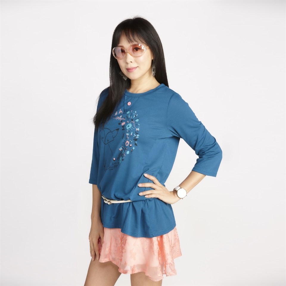 04.圓型領設計,可修飾臉型,印花為設計展現清新的風格,前片有鈕釦做點綴提昇整體感。
