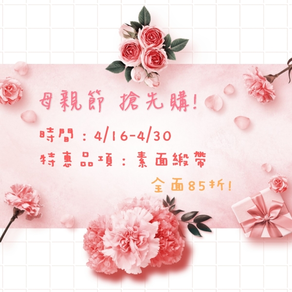 活動內容:母親節特賣專區 通通85折(素面緞帶&部分手拉花)