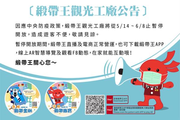 疫情嚴重,緞帶王為了配合政府防疫政策,自今日起至6/8 休園不對外開放,但是各位不用擔心,現在只需要下載APP,就可以體驗到真人語音導覽。