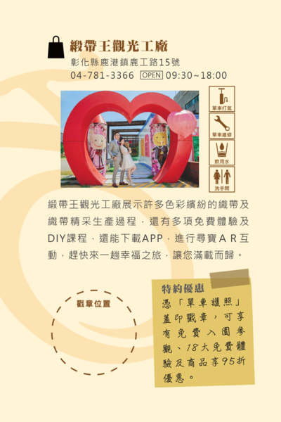 只要憑單車護照蓋印戳章來【緞帶王觀光工廠】可享特約優惠有:
