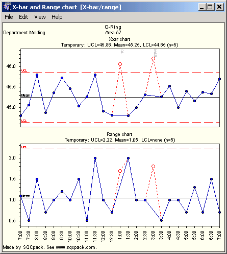An X-bar and R chart is a pair of control charts used with processes that have a subgroup size of two or more. The standard chart for variables data, X-bar and R charts help determine if a process is stable and predictable. Always look at the Range chart first. There should be more than five distinct values plotted, and no one value should appear more than 25% of the time. If there are values repeated too often, then you have inadequate resolution of your measurements, which will adversely affect your control limit calculations. After reviewing the Range chart, interpret the points on the X-bar chart relative to the control limits. Never consider the points on the X-bar chart relative to specifications, since the observations from the process vary much more than the subgroup averages.