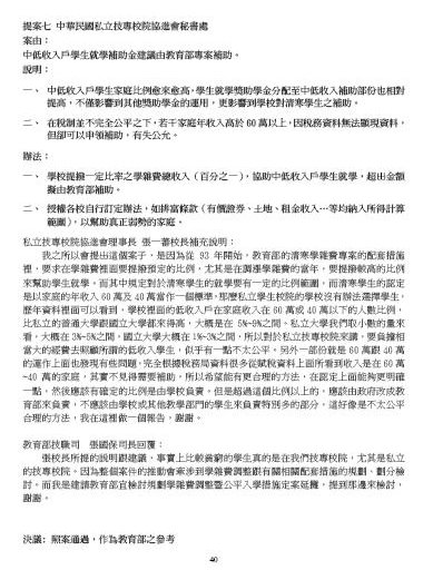 我之所以會提出這個案子,是因為從93年開始,教育部的清寒學雜費專案的配套措施裡,要求在學雜費裡面要提撥預定的比例,尤其是在調漲學雜費的當年,要提撥較高的比例來幫助學生就學。而其中規定對於清寒學生的補助要有一定比例的範圍,而清寒學生的認定是以家庭的年收入60萬及40萬當作一個標準,那麼私立學生的學校沒有辦法選擇學生,歷年資料裡面可以看到,學校裡面的低收入戶在家庭收入在60萬或40萬以下的人數比例,比私立的普通大學跟國立大學都來得高,大概是在5%~9%之間。私立大學我們取小數的量來看,大概在3%~5%之間,國立大學大概在1%~3%之間,所以對於私立技專校院來講,要負擔相當大的經費去照顧所謂的低收入學生,似乎有一點不太公平。另外一部份就是60萬跟40萬的運作上面也發現有些問題,完全根據稅務局資料很多從賦稅資料上面所看到收入是在60萬~40萬的家庭,其實不見得需要補助,所以希望能有更合理的方法,在認定上面能夠更明確一點,然後應該有確定的比例是由學校負責。但是超過這個比例以上的,應該由政府改成教育部來負責,不應該由學校或其他教學部門的學生來負責特別多的部分,這好像是不太公平合理的方法,我在這裡做一個報告,謝謝。
