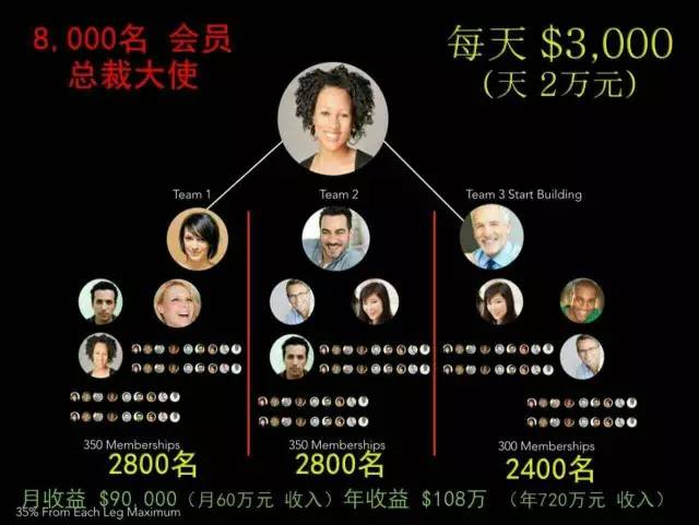 達到總裁大使級,團隊成員8000人,最多每日收入3000美金,每月約270萬台幣;