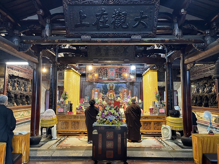 正殿神龕中最深處,主神觀音佛祖戴著金冠,頭後金色圓光如日輪,靜靜發亮著。觀音佛祖之前,為斗姥天尊──道教中掌管北斗、救苦救難之女神。她的雙手分別捧持日月,其他臂膀則持蓮花、法輪、木魚等器物,動靜兼具,氣象莊嚴。最外側另一尊觀音,手捧淨瓶,姿態溫柔,神情低眉含笑,似正凝視著芸芸眾生。三尊神像,自內而外構成一層層信仰的遞進與護持,佛道合一,無需界分。