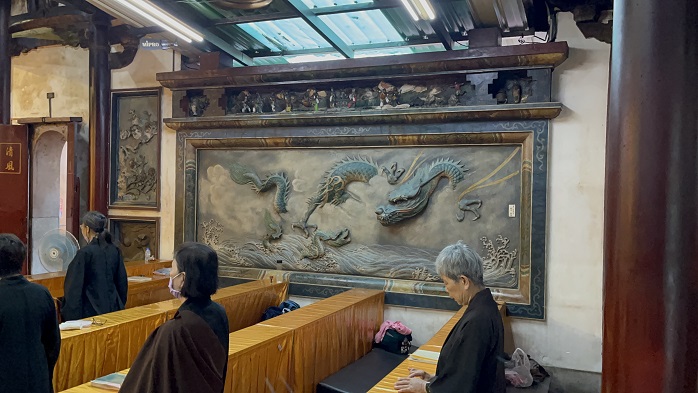 來訪時,適逢早課。一位出家師父領著數位居士於正殿誦經持咒,聲音如涓涓溪水,流經木構古樑與牌匾。香煙裊裊升起,陽光灑入廟宇深處,光影與誦聲交錯,沉浸其中,心神也隨之澄明。