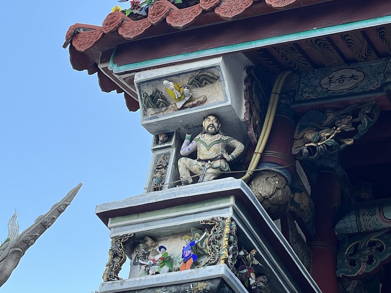 為避免打擾早課進行,旋即步出大門,轉向興濟宮,一抬頭可見屋簷墀頭上的「憨番抬厝角」泥塑,頸繫雲肩,姿態憨厚,服色樸實,明顯異於鮮豔的交趾陶。他們無聲撐扶起的,不只是屋脊,更似承接著庶民對神明的祈望。