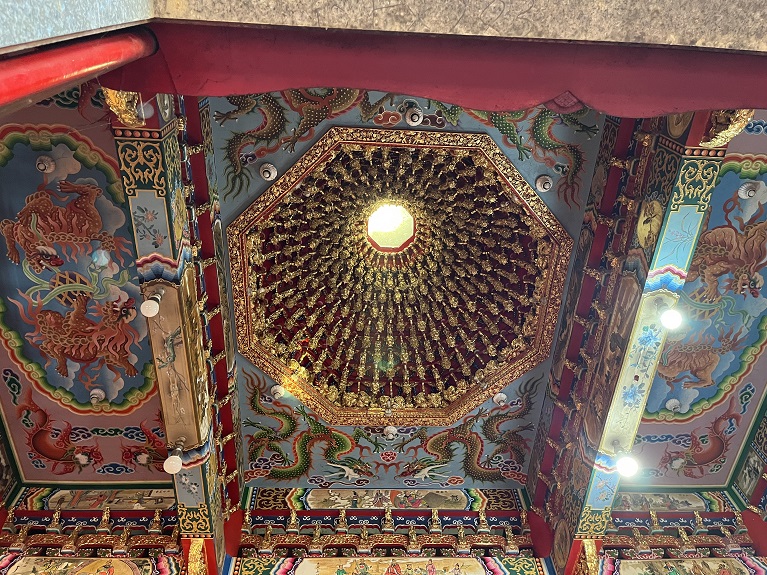 拾級而上,三樓無極金母殿供奉無極瑤池金母娘娘,頂層的八卦藻井中央鑲嵌透明玻璃,天清時,陽光自八卦中心口傾瀉而下,將整個無極金母殿映照得靜謐而神聖。