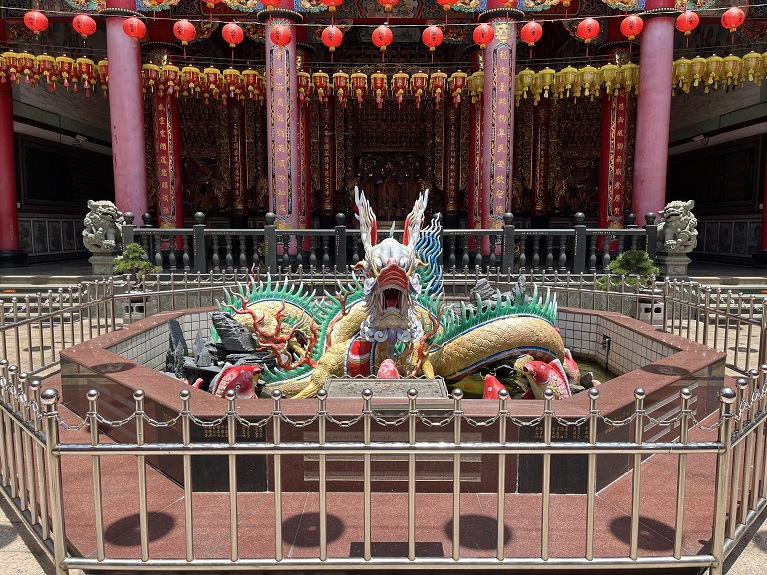 走入福興宮,廟門內的拜殿橫樑上方繪著「後天八卦」,正殿橫樑中央則是「先天八卦」,象徵宇宙陰陽流轉。正殿供奉七位王爺,後殿供奉七位夫人,後殿前的蟠龍鎮守在八卦池中,氣勢磅礴。