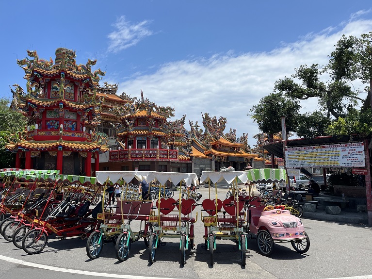 盛夏午後,我騎著租來的自行車,自永安漁港出發,緩緩穿行在新屋綠色走廊。腳下鋪滿葉影的自行車道綿延向前,兩旁林木蓊蓊鬱鬱,遠方的海水在陽光下閃爍。騎至自行車道盡頭,左轉穿越快速道路橋樑下方,我看見了那座黃瓦紅牆、靜默矗立的廟宇——新屋福興宮。