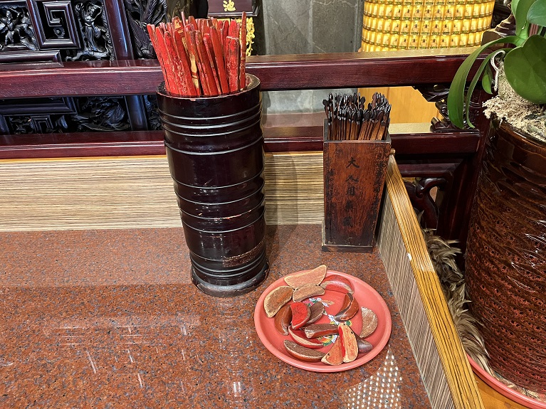 另外,廟內的智慧型籤詩機、光明燈系統等,亦巧妙地將科技元素與古老的宗教信仰相結合。然而,最讓人感到與神祇心靈相通的,莫過於擲筊的儀式。當我站在大理石檯面前,輕輕擲起兩個小小的聖筊,看著它們在檯面上微微碰撞後落定,心中彷彿能聽見神明的低語,感受到一股神聖的力量。