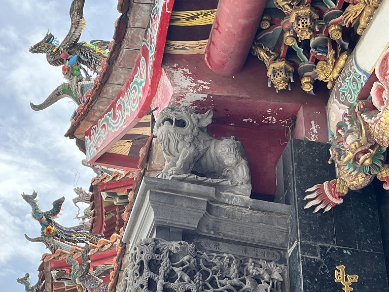立於廟前,望向三川殿的屋脊上,可見諸多剪黏技術的瑰寶——色彩斑斕的陶瓷片精緻地拼貼成各種花鳥、龍虎。這些脊飾,不僅展示了廟宇的華麗,也傳遞了庇護與神聖的寓意。尤其是墀頭上歷史人物的交趾燒與剪黏,彷彿在訴說著一段段英雄傳奇與歷史故事。同時,幾乎每一處角落都能發現石獅的身影,它們或坐、或站、或威武,或俏皮,形態各異,卻總能保持一種獨特的秩序與美感。