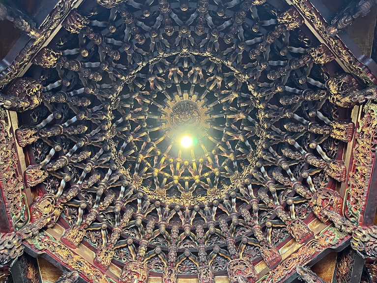 走進池和宮,彷彿踏入了一段時光隧道,古老與現代並存。最引人注目的,便是供桌上方以水泥仿古技術建造的藻井。這種複雜而精美的結構亦稱「蜘蛛結網」,展示著匠師的巧妙匠心。雖以水泥為材料,但藻井的設計又不失傳統古建築的韻味。從這些微妙的藝術手法中,我能感受到廟宇內每一塊石雕、每一根樑柱所蘊含的歲月痕跡。