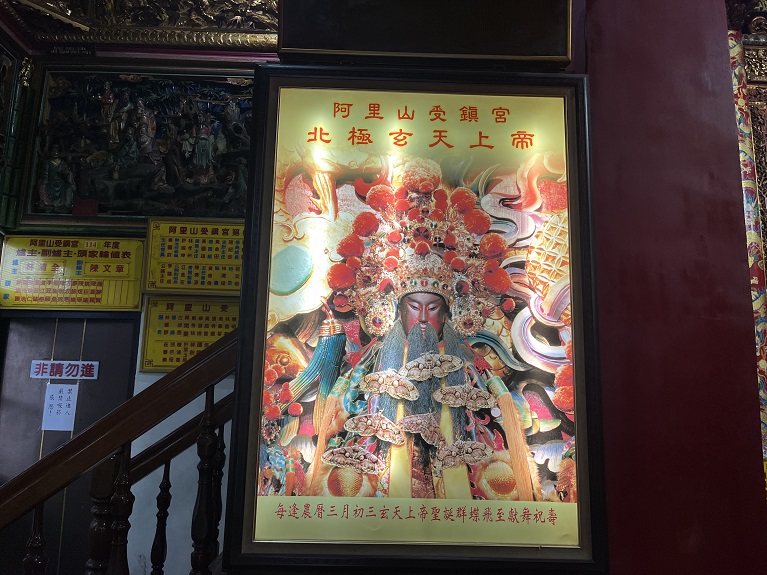 正殿一側的牆面上,懸掛著一幀珍貴的照片,那是神蛾停駐於玄天上帝神像衣冠上的畫面。畫面中的蛾類安靜地伏於神像上,雙翅展開如羽扇,彷彿正以無聲的方式向神明獻上祝壽之意。對信徒而言,那不只是自然現象,而是一種天人感應的印證;對旅人而言,則是神話與現實交會的瞬間。