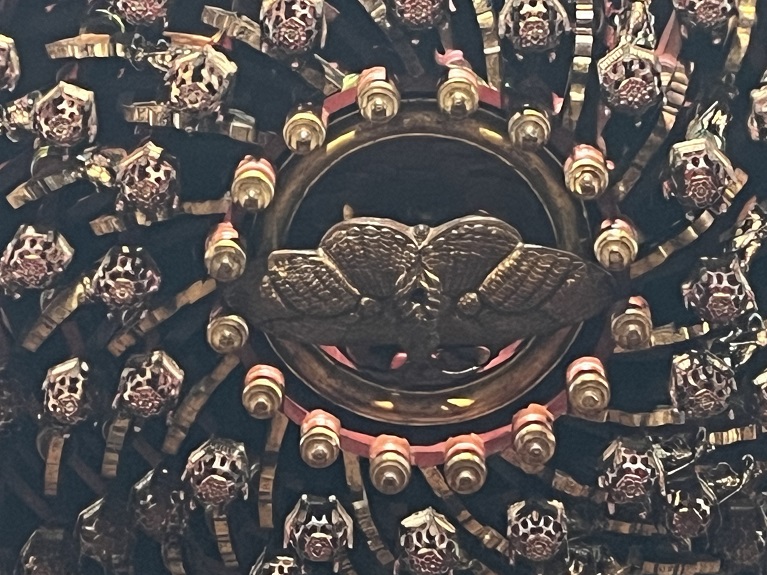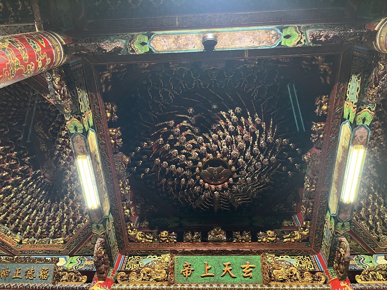 踏入正殿,仰望屋頂,是全台罕見的下沉式螺旋藻井——逐層向下增厚,彷彿天地之門逐層開啟。最底部,一隻栩栩如生的「神蛾」雕刻靜臥其中,呼應每年三月神蛾朝拜的神蹟。