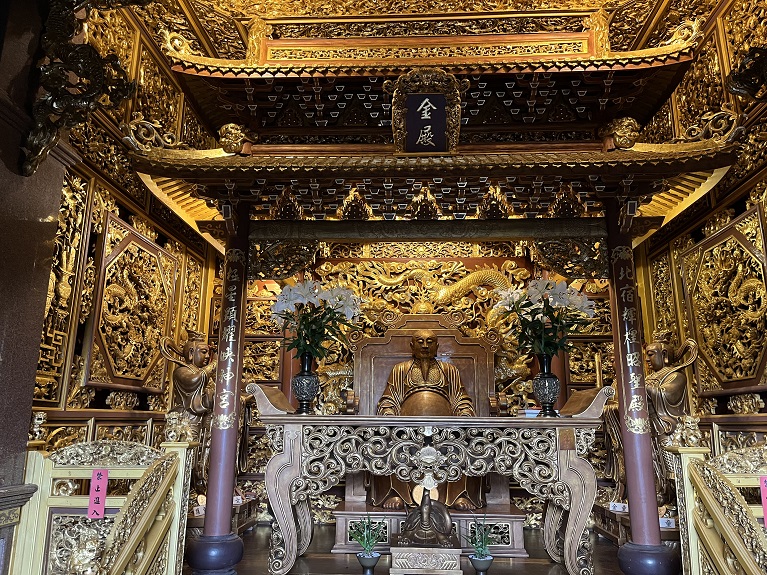 後殿二樓為仿照武當山金殿建造之金色神殿,金光燦爛、莊嚴華麗。真武大帝端坐其中,護法神靈齊列:金童、玉女、水火二將、龜蛇二將,這空間彷彿超脫塵世之外。