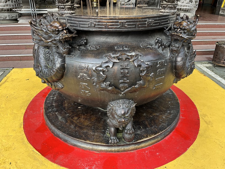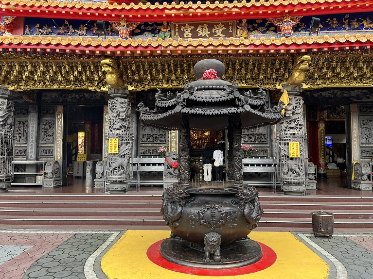 站在受鎮宮前,首先映入眼簾的,是氣勢非凡的屋簷裝飾與香爐。屋簷上雕龍繪鳳,四大天王神態威嚴,是鎮守這片聖地的象徵。而香爐則由三頭獅子扛起,四周七龍盤繞,中軸環以五蝠(五福),寓意福氣長存。龍鳳騰飛於爐頂,猶如神獸守護天門,氣勢磅礡,展現出建築工藝與信仰美學的完美融合。