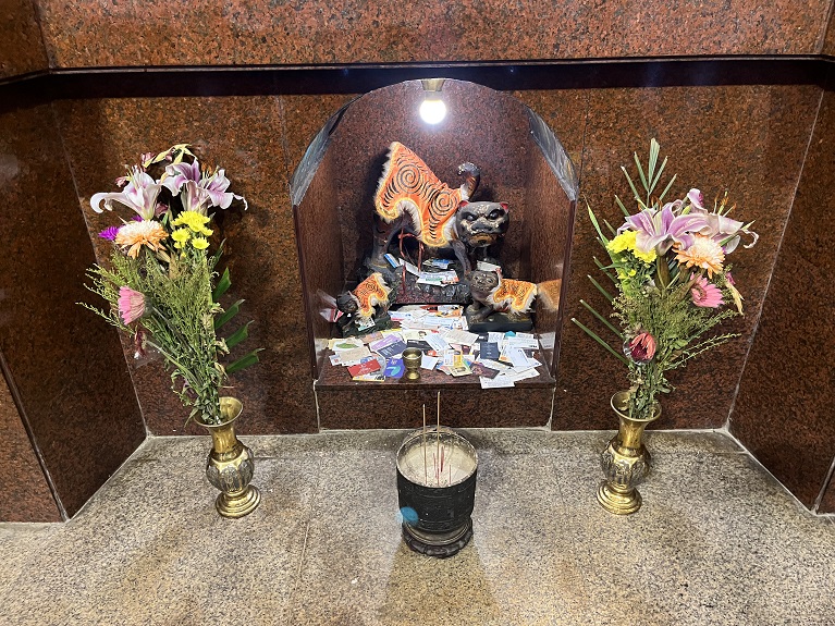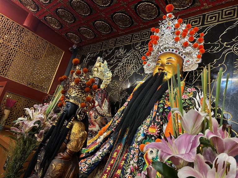 這次前往靈祐宮參訪,在廟方人員的特別邀請下,我得以走入平時不對外開放的神龕內部,近距離親睹鎮殿神像——金面玄天上帝。那是一尊泥塑而成的坐姿神像,金面生輝,雙手安置於腹前,跣足而坐,不踏龜蛇。因神衣覆蓋,雙手之「抱壽體」難以辨識,但整體形貌蘊含明代真武神像的古樸氣韻。金面所映之光,不僅是對神格崇高的禮讚,更是一種直抵心靈的震撼。在神燈閃爍與香煙裊裊之間,上帝公彷彿自時光深處凝視而來,靜默且莊嚴,令人屏息。
