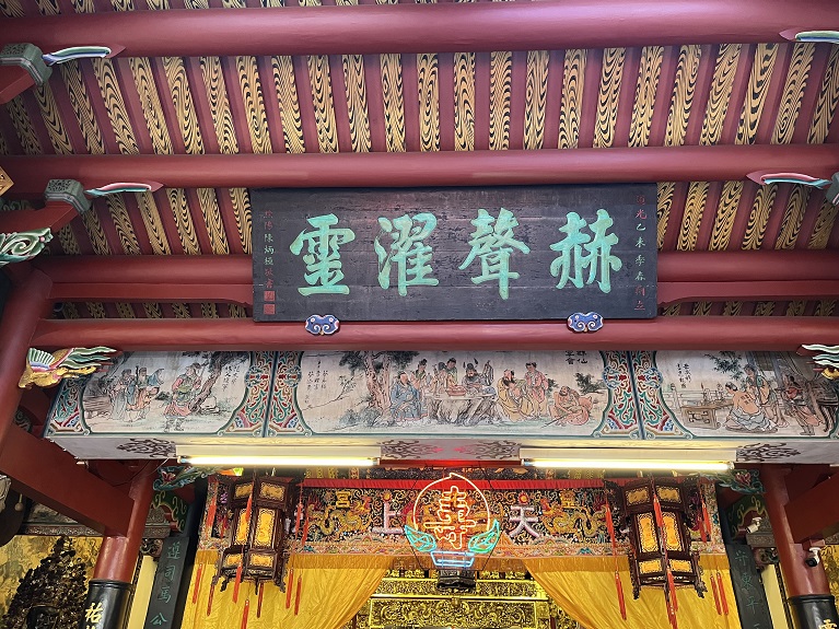 站在正殿之下,我仰望那道高懸於上方、題於道光15年(1835年)的古匾「赫聲濯靈」。匾額字跡蒼勁有力,猶如至今仍在宣示玄天上帝威靈赫赫,足以濯洗塵世之惡。一旁牆面則可見大正3年(1914年)重修時所立之碑記,銘刻著當年信徒與地方士紳齊心守護信仰的深情與厚意。